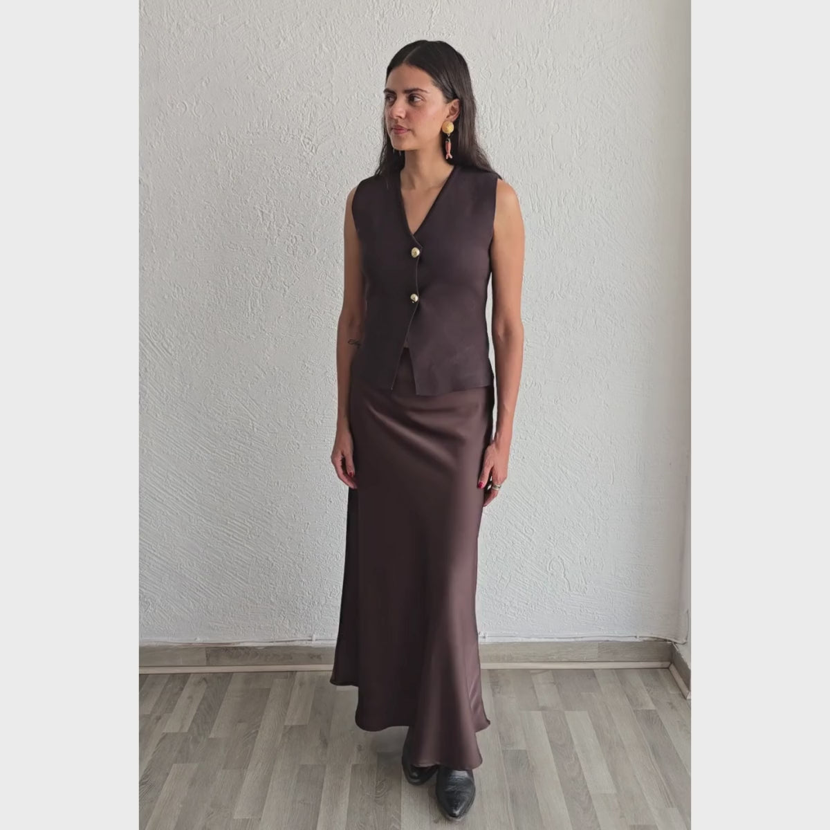 Chaleco de punto asimétrico con dos botones dorados al frente. Dos colores disponibles café chocolate y blanco!