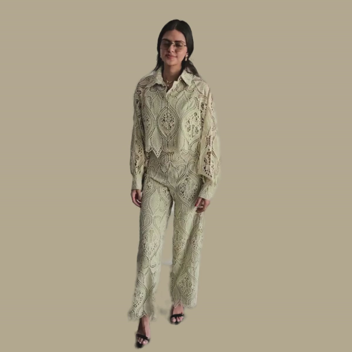 Set de encaje pantalón y blusa de botones color verde pistache.