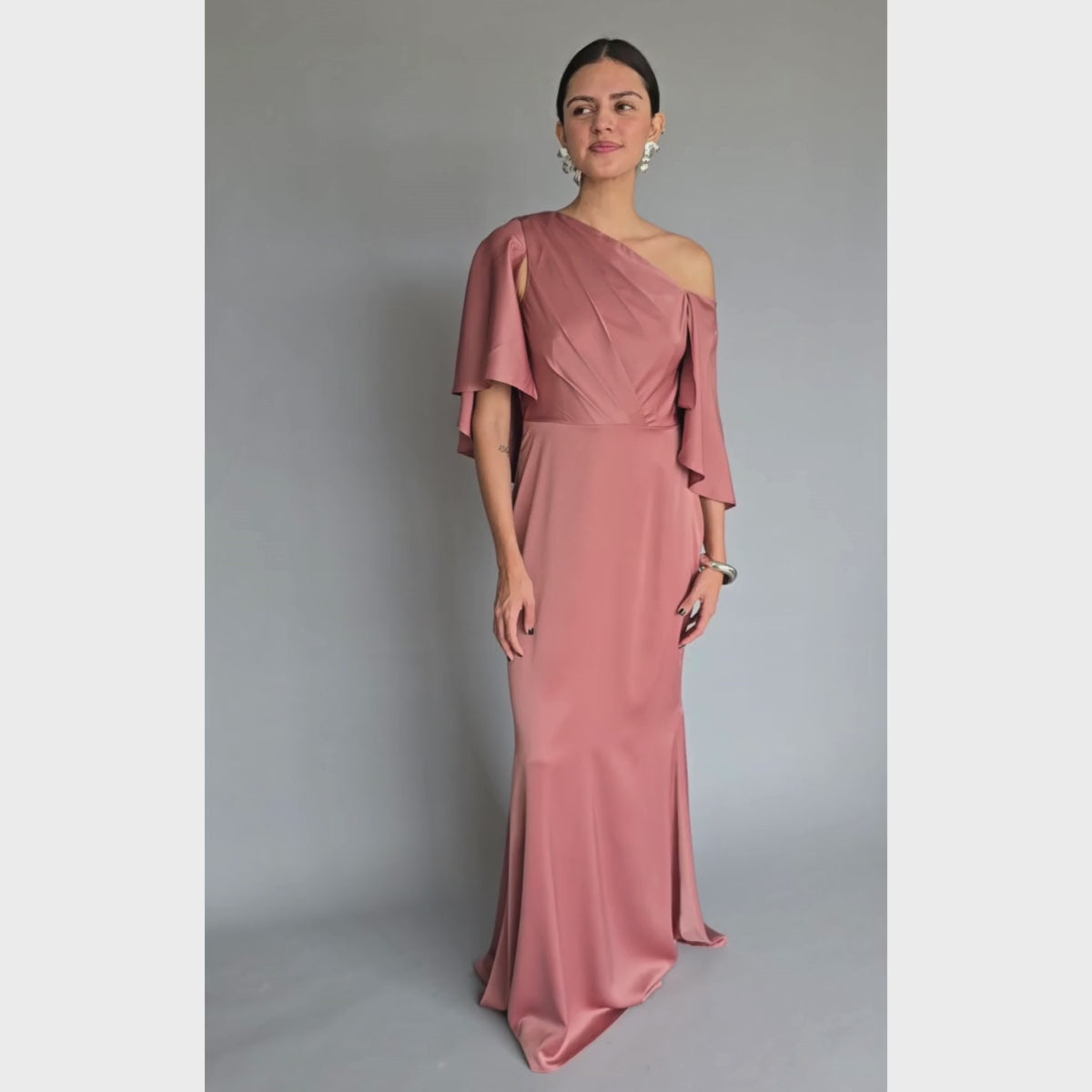 Vestido de tela satinada, hombro asimétrico y capa. Disponible en palo de rosa y azul rey