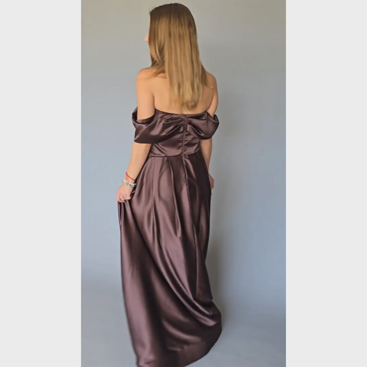 Hermoso vestido de fiesta satinado escote de corazón color chocolate